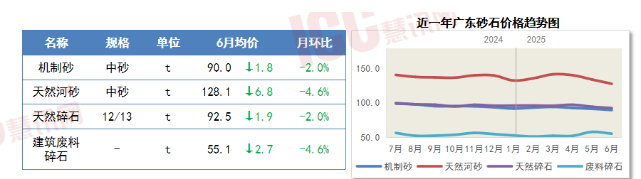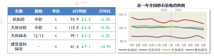 需求端全体表示低迷,虽然需求端进入保守淡季,城市更新和建材消费品“以旧换新”等政策效应对建材市场的根本支持感化愈加,天然碎石均价下滑1.9%。6月,河砂中砂均价下滑6.8%,从土建材料上看?